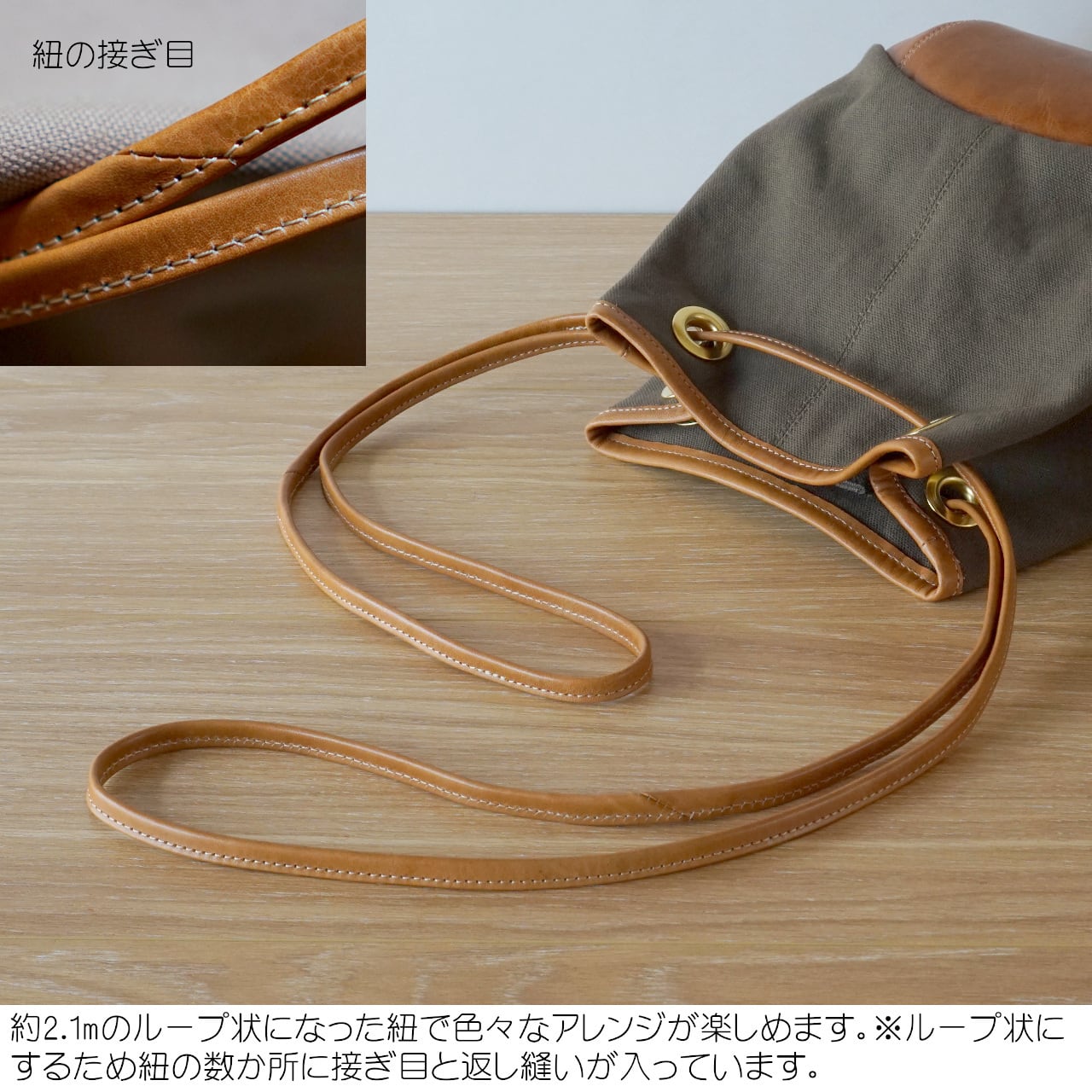ちょっとそこまでのお出かけにちょうど良い巾着バッグです。小ぶりながらもマチを広くとって見た目以上の収納力!(幅20cm程の長財布を横にして入れることが可能です)底は立体的な球体上に型出し、本革を使用することで型崩れを防ぎ美しいフォルムを保ちます。使用感の出やすい口部分と紐部分にも強度の高い本革を使用。バッグ全体に上品さが増して、大人可愛い表情が生まれました。約2.1mのループ状になった紐で色々なアレンジが楽しめます。気分に合わせて左右で結んでハンドバッグに!片方だけ結んで肩掛けに!さらには長めに調節して斜め掛けといった3wayで機能的にお持ちいただけます☆バッグの口はボタン付きで安心感があります。内側にポケットを1つ配置して鍵などが収納可能です。必要なものだけ余裕を持って収納できるサイズ感です。